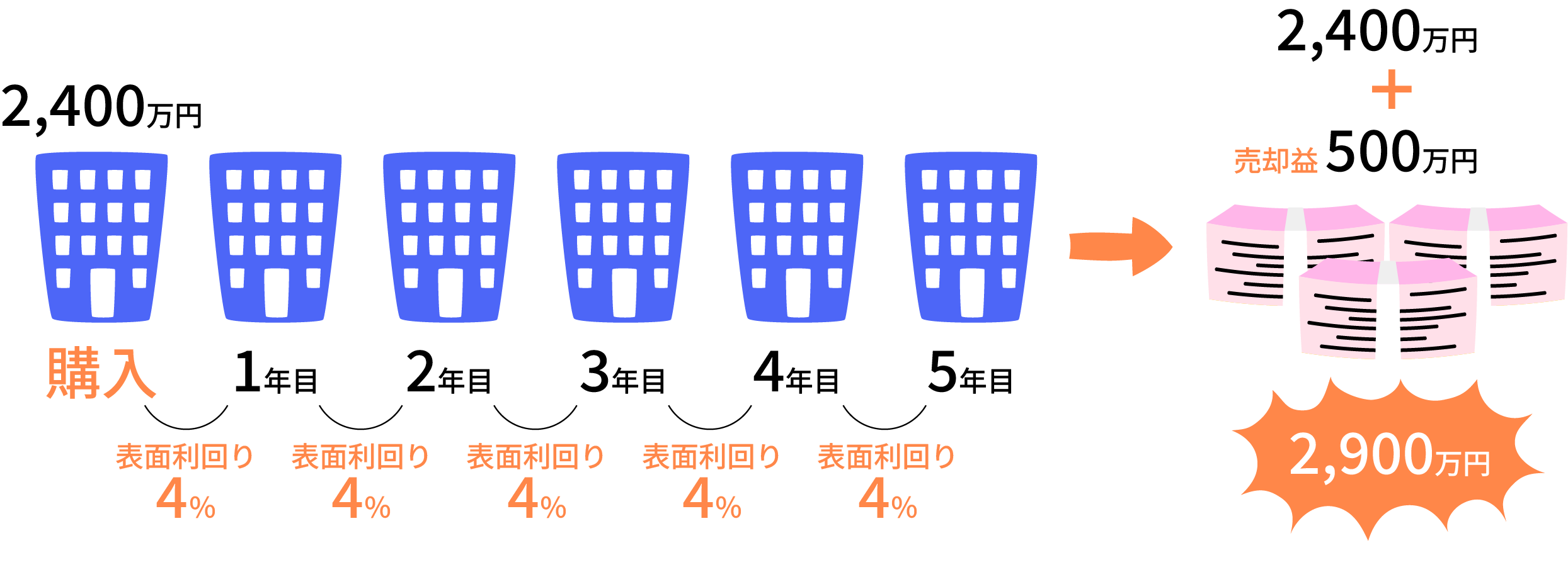 2,400万円の中古ワンルームマンション、表面利回り4%。一見、利回りはそれほど高くないように見えますが、立地や建物の質、賃貸需要などをしっかりと見極め、「ルール」に沿って選んだ物件。5年間安定して家賃収入を得ながら保有し、売却したところ、売却益として500万円を得られたケース。